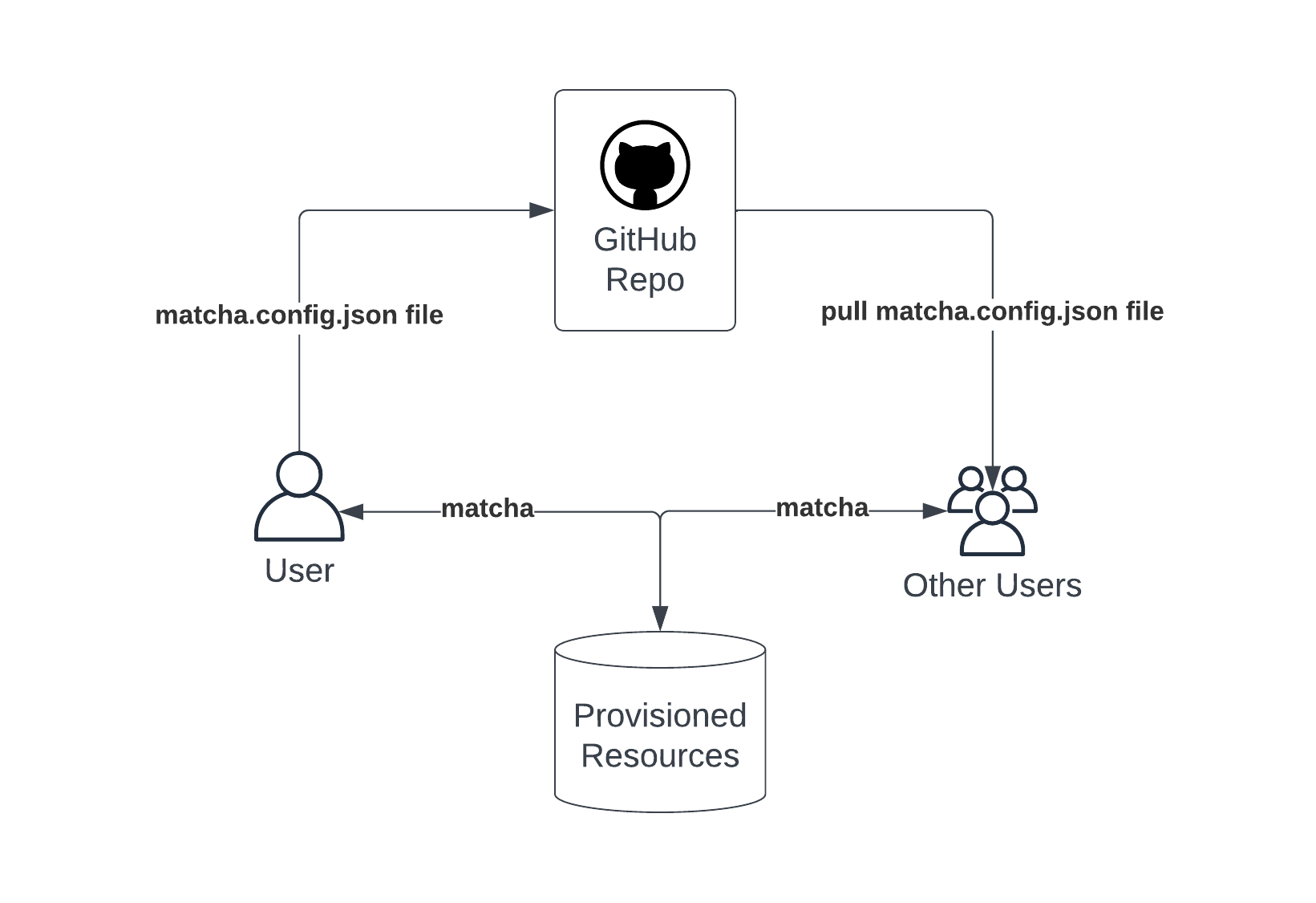 In order to access your provisioned resources, other users will need to ensure this configuration file exists locally, in the same directory where the file was originally created. We suggest that the matcha.config.json file be included within the project repository and shared using GitHub or similar repository hosting tools. The user will also have to: